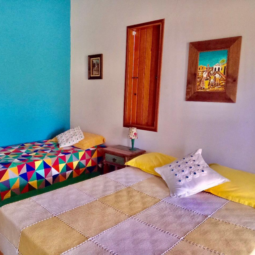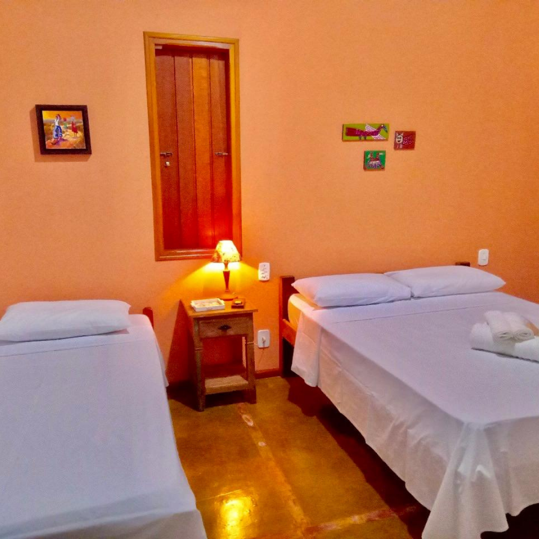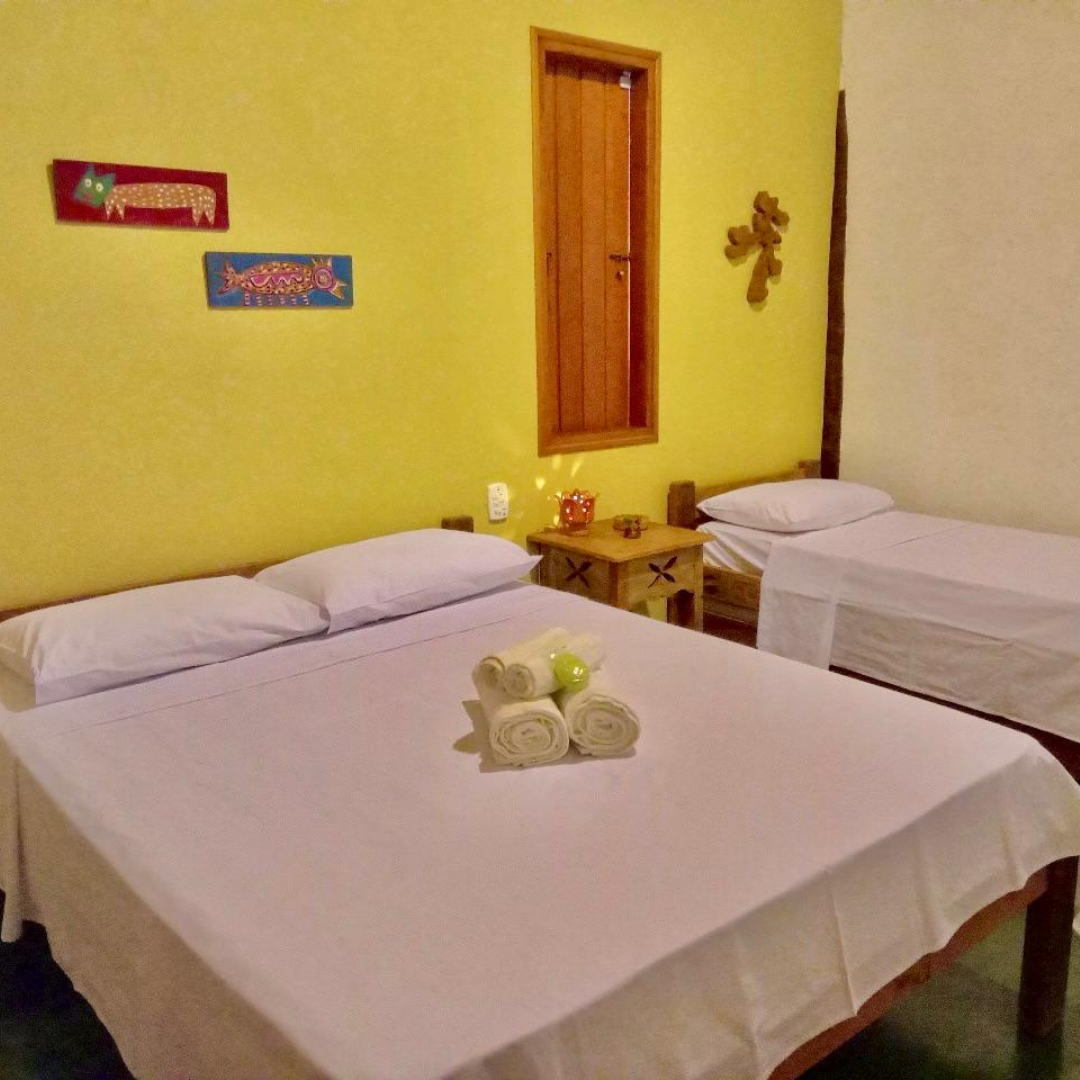 Os quartos são equipados com uma cama de casal e duas camas de solteiro do tipo bicama, além de ventilador de teto, climatizador e sinal de internet Wi-Fi, garantindo bem-estar em qualquer época do ano.